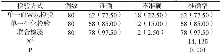 联合检验的诊断准确率高于单一血常规检验和单一生化检验(P<0.05)。见表 3。