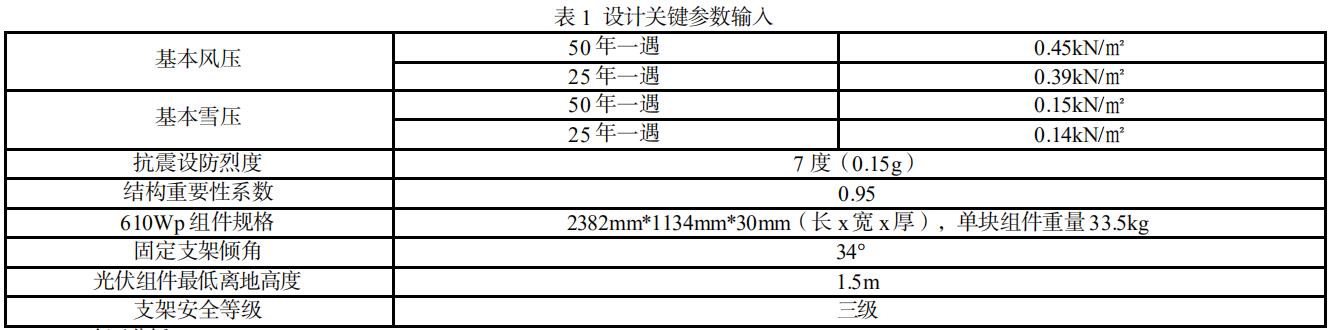 某地面集中式光伏发电项目,采用倾角固定式安装方案,组件规格610Wp,尺寸2382X1134 x30mm,单块组件质量33.5 kg;支架倾角为34 度,光伏组件最低离地高度1.5m。支架采用双桩双立柱支架方案,基础采用螺旋钢桩基础。支架主要由立柱、斜梁、斜撑以及檩条组成,支架与基础为刚接,立柱与横梁、斜撑与横梁、斜撑与立柱、斜梁与檩条之间均为铰接。每个光伏组串支架单元由52 块组件组成,光伏组件采用竖向布置,2 行26 列排布方式,单个光伏组件串东西长约30m。