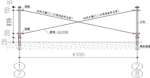 图1 纵向柱间支撑方案布置示意图(圆钢+抱箍)