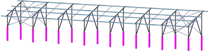 柱间支撑布置方案构建了 2×26 阵列的支架系统计算模型(见图 4),风、雪荷载相关参数按照《建筑结构荷载规范》GB50009-2012执行,具体参数详见表1。