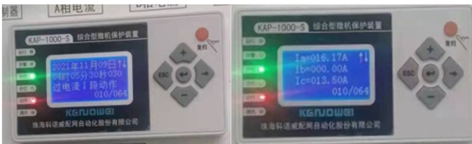 2021 年 11 月 4 日,该 10kV 变压器器投入运行,2021 年 11 月 09 日 04 时 05 分 30 秒,10kV 变压器高压侧进线柜断路器发生过流 I 段保护动作跳闸,变压器 400V 低压侧断路器没有保护动作信息10kV 断路器柜过流 I 段保护整定电流为 10.9A,互感器变比为 200/5,动作时间 0 秒。故障时故障电流分别为 Ia=16.17A,Ib=0A,Ic=13.5A,经计算,故障时流过高压柜 001 断路器的 A 相电流为 646.8A,C 相为 540A。