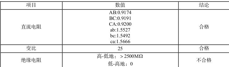 故障发生后,工作人员对变压器进行了电气试验,变压器直流电阻和变比检查正常,绝缘电阻检查不合格,试验结果如下: