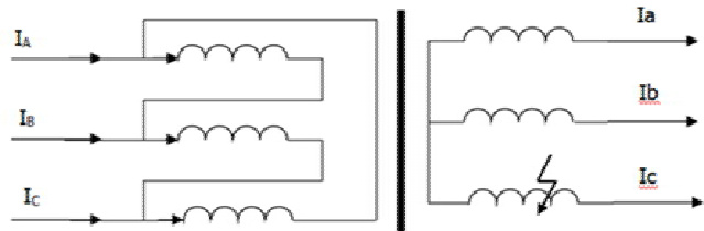 该变压器连接方式为 ΔDYnll 。当低压侧 C 相绕组对铁芯及地短路时,流过低压绕组 C 相电流 IC非常大,而流过低压 A 相和 B 相的电流接近正常电流(约等于零)。根据变压器电磁感应原理,流过高压侧绕组 A 相和 B 相的电流也接近正常电流(约等于零),而流过高压侧 C 相的电流为极大的短路电流 IC 相。