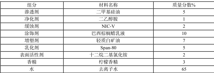 巴西棕榈蜡乳液,抚顺石油二厂;Span-80,南通辰润化工有限公司;十二烷二基氯化铵,二乙醇胺、二甲基硅油、均为化学纯级,深圳昊翔化工有限公司;NIC-V,广州拓新化工科技有限公司;轻质白矿油,广州穗欣化工有限公司;柠檬香精,工业级,深圳市通球化工有限公司: