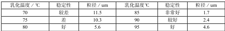 由表 3 数据可知,乳化温度过低会导致乳液粒径粗糙,温度过高则会增加乳化环节的成本。结合乳液外观质量与制备成本两方面因素,试验最终选择将乳化温度设定在 85℃左右。这一温度下制得的乳液,外观均匀细腻,且贮存过程中性能稳定,符合预期要求。