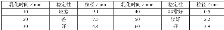 从表 3 的数据能观察到,随着乳化时间的增加,所研制乳液的外观粒径逐步变小,而贮存稳定性则先变好后变差。这是因为:当乳化时间少于 20 分钟时,乳液分散效果不佳,乳化剂、蜡、水等原料混合不够均匀,导致产品稳定性受影响;若乳化时间超过 50 分钟,过度分散会让乳液严重增稠,不仅增加生产能耗,贮存性能也会随之下降。综合试验结果,确定乳化时间控制在 40 分钟左右较为适宜。