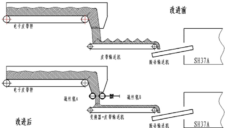 2.3 通过调整疏料辊中心距和转速,使部分物料延时下落。通过变频器调整皮带输送机速度,使电子皮带秤与皮带输送机的输送速度匹配。