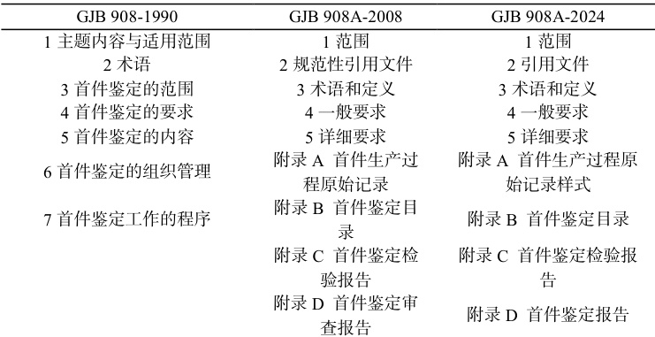 相较于 GJB 908-1990,GJB 908A-2024 的结构和内容变化比较大,主体结构从 7部分,变成 5 部分及 4 个附录,删除了原标准中的“首件鉴定的组织管理”,增加了“首件鉴定的记录”要求,相较于 GJB 908A-2008,结构变化较少,见表 1。