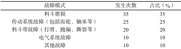 从表 1 中可以看出,料斗磨损是最为常见的故障模式,占比达到 35% ,其次是传动系统故障和料斗带故障。这些故障模式严重影响了斗式提升机的正常运行,需要重点关注和分析。