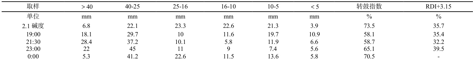 从低碱度烧结矿物理、化学指标及低温还原粉化率看出,受配加、调整原高碱度自返影响,烧结矿碱度波动较大,直至配加产生的自产低碱度返矿后烧结矿指标逐渐趋于正常,但受生产时间及返矿循环影响,烧结矿碱度未达到0.4 的目标水平;烧结矿粒度组成较好, 5.10mm 粒级好于高碱度烧结矿;烧结矿转鼓强度较低在 60% 左右(落地点取样为 70.5% ),低于基准 13% ;烧结矿 RDI 指标有上升趋势到 39.5% ;烧结矿FeO( 11% 左右)基本达到预计控制目标值。