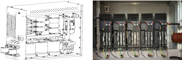 为逆变部分的核心部件,为三相交流690V 输入,单相PWM 逆变输出。单元自身具备故障检测、保护以及状态上报功能。功率单元外观如下图。