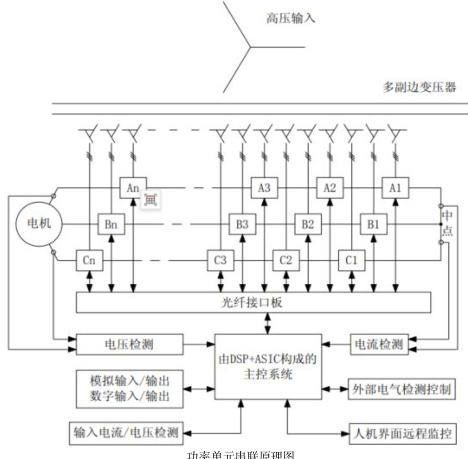 为变频器的核心功率部分,内装多个 H 桥功率单元,变频器的每相输出由若干个功率单元串联得到,通过协调控制各个功率单元发出的PWM 波形得到变频变压的三相输出,对电机进行变频调速。