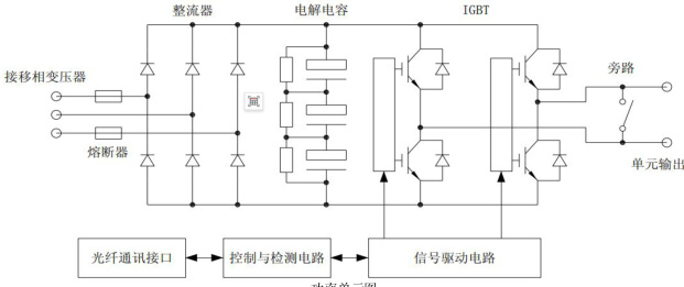功率单元相当于 1 个单相逆变器,其电气原理图如下图所示,主要包括三相桥式整流电路、电容器组和 IGBT(或者 IPM)逆变电路以及负责光纤通讯、PWM 控制、故障检测与保护的控制电路。