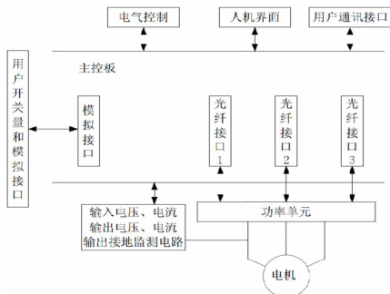 主控系统框图如上图,主要由主控板、外部接口及一些检测电流构成。电气控制接口负责电气开关的控制以及用户操作指令的接收。主控板由主控电路、监控电路、液晶人机界面通讯接口、电压电流检测电路以及光纤通讯电路组成。主控电路负责PWM 脉冲的计算并通过光纤通讯电路发送到功率单元。