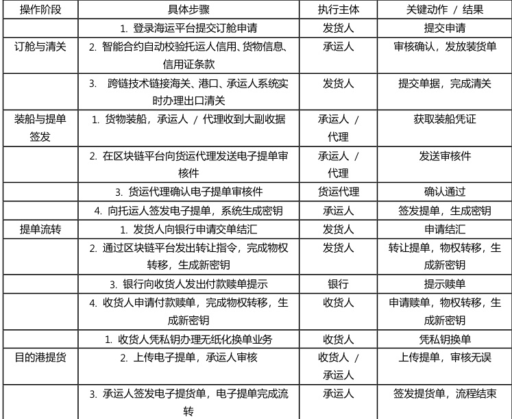 区块链技术重塑着传统航运的操作流程,将原本繁琐的 纸质单据流转变为高效便捷的数字化操作。该流程贯穿订舱 清关、装船签发、提单流转及目的港提货等操作阶段,各参 与主体在明确的框架下完成操作,确保单据流转的安全性与 可追溯性。具体操作细节如下表所示: