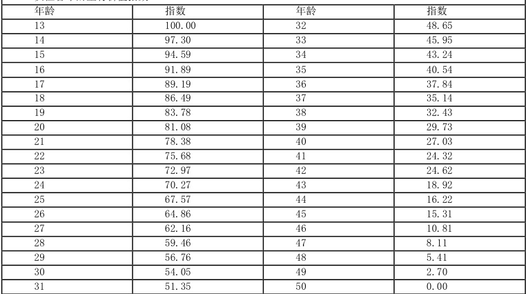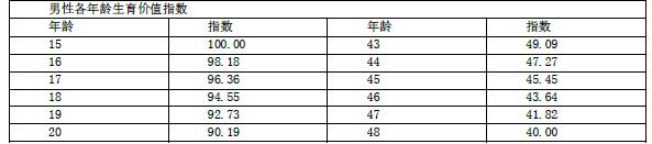 将男性生育期内各年龄段对应评分指数列表可得下表: