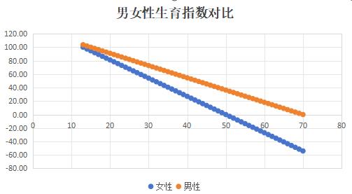 可以看到生育指数同为60 时,男性比女性大了9.2 岁,到这里可以得出男生花期相对很长的结论,所以法定退休年龄男性晚了10 年,也是作为比女性多10 年及格活力的惩罚。当然,通过指数对比还可以发现更多的生育秘密,聪明的你发现了吗?