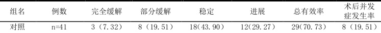 参照世界卫生组织对实体瘤的近期疗效评定标准[3],对两组予以完全缓解、部分缓解、稳定、进展四个阶段的临床疗效划分,同时,统计两组术后并发症发生率。