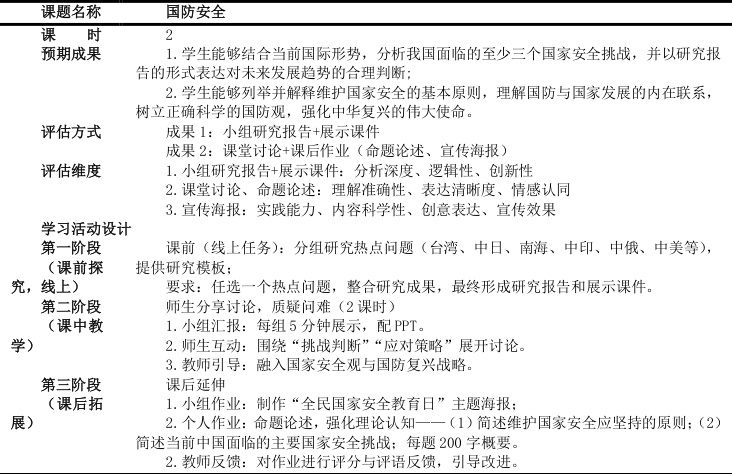 依据 OBE 理念,我们设计了全新的课型——小组合作探究式教学模式——以小组合作探究为学习形式,线上与线下相结合,课内与课外相协作。我们拿《国防安全》这一节课的教学设计举例说明: