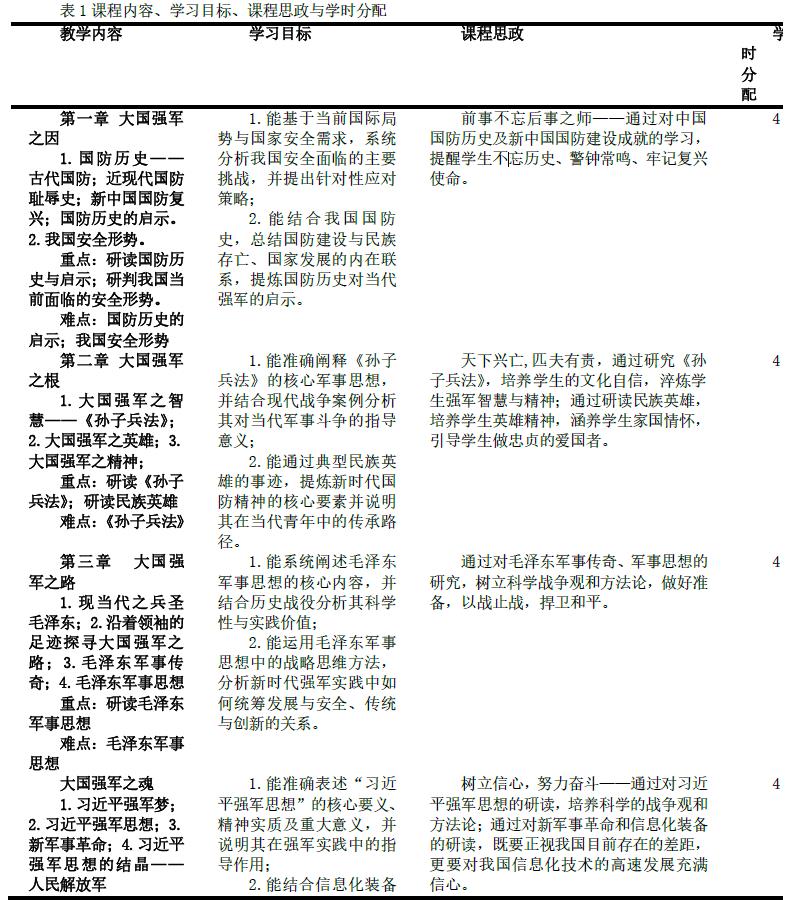 遵循习近平强军思想,基于民族国防史、国防环境迭代、军事科技变革、智能化战争形态发展,建构《大国强军》课程内容,共设计了四个模块,每个模块的课程内容、学习目标、课程思政与学时分配如表1: