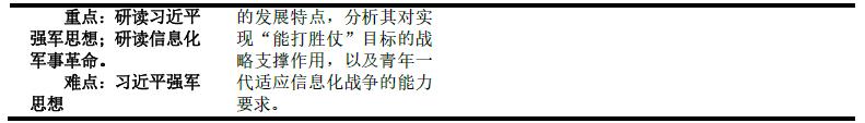 3.素质目标:逐步形成对国防复兴的使命感和责任感;树立科学的战争观、国防观和方法论,树立国防复兴、打赢现代战争的坚定信心;正确认识世界,正确认识中国发展大势,正确认识中国与世界的关系。