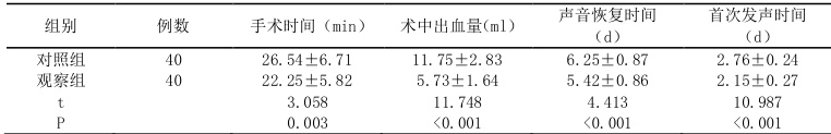 (1)临床指标:涉及手术时间、术中出血量、声音恢复时间、首次发声时间。(2)治疗效果:显效:病灶消失,可恢复正常发声,声门可正常闭合。有效:病灶消失,发声有所转好,声门不能完全闭合,存在较小的间隙。无效:发声同治疗前无变化,声门不能正常闭合,声带处于充血、肿胀状态。前两项人数之和的占比为总有效率。