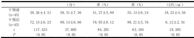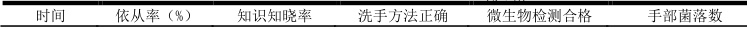 干预后的手卫生依从率、知识知晓率、洗手方法正确率及微生物检测合格率均显著高于干预前 (P⟨0.05) 。见表1。