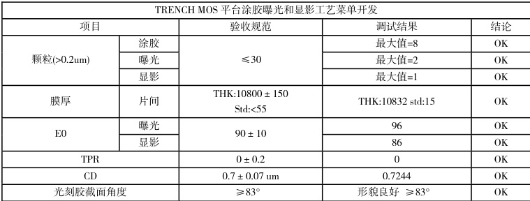 本文就 TRENCH MOS 平台涂胶曝光和显影工艺菜单开发所需验证的涂胶膜厚厚度、膜厚均匀性,曝光 E0、TPR,显影 E0 等匹配数据进行分析来说明通过 TRENCH MOS 平台涂胶曝光和显影工艺菜单开发,使得 CD 精度可以达到 0.7um 且图形显开区光刻胶形貌符合工艺规范。