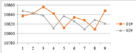 由图 2 可知,膜厚测试 9 点均在规范膜厚内,且其均匀性复合工艺规范,测试结果均满足规范要求:(THK:10800