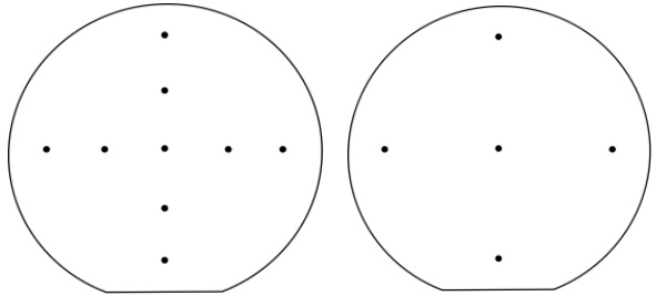 A) 光刻胶测试点图案:光刻胶膜厚测试的 MAP 图见图 4.1,为 9 点测试法;CD 测试点图案:CD 测试的MAP 见图 4.2,为 5 点测试法。