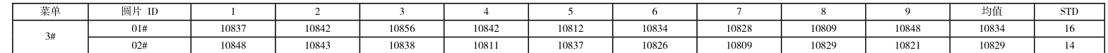 ⅰ).验证过程:用菜单 15#在 2 片裸硅片涂胶后,在曝光机台用 E0.E0 菜单进行曝光,随后于 PTT03-D 进行显影。完成后在显微镜进行读值。读值数据见表 3。