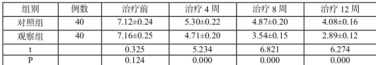 观察组治疗4 周、8 周、12 周后的VAS 评分均低于对照组 P<0.05) 见表1