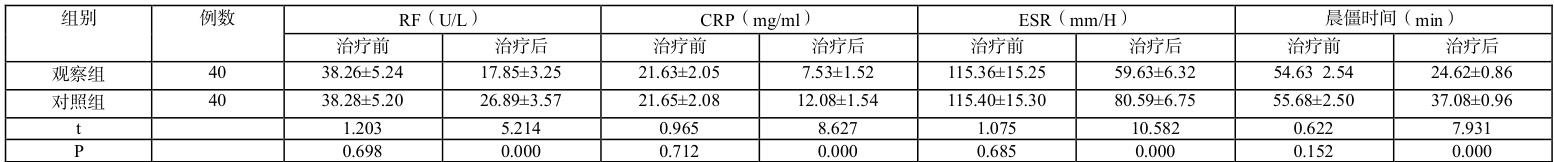 选取 2024 年 1 月至 2024 年 12 月在我院接受治疗的 80 例类风湿关节炎患者,按照随机数字表法分组,各40 例,对照组中,男15 例,女 25 例;年龄25-65 岁,平均年龄( 45.2±5 .6)岁;病程 1~10 年,平均病程( 5.2±2.1 )年。观察组中,男 14 例,女 26 例;年龄 26-64 岁,平均年龄