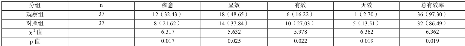 治疗总有效率观察组 97.30% ,对照组 86.49% , P<0.05, 。