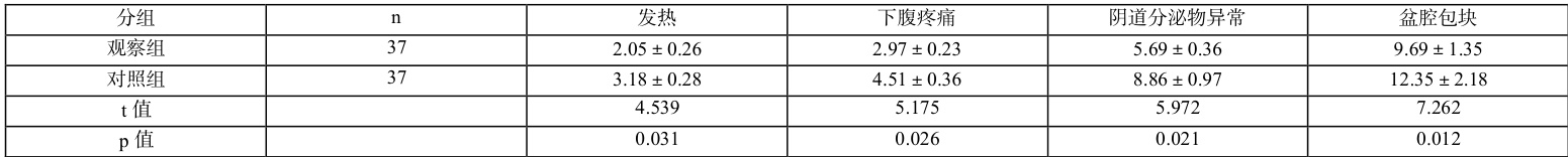 发热、下腹疼痛以及阴道分泌物异常和盆腔包块等消失时间 P<0.05 。