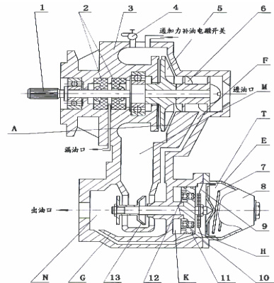 1.传动轴 2. 封严皮碗 3.油泵壳体 4.放油开关 5.叶轮 6.导流器 7.调整弹簧 8.盖子 9.弹簧薄膜 10.缓冲活塞11.开口环 12.单向活门 13.活门 14.活门杆