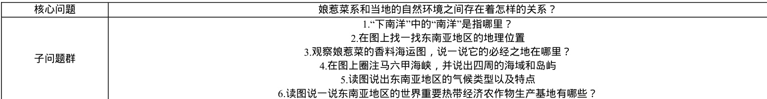 基于以上分析,设计的核心目标如下:通过在地图上面找到东南亚的位置和范围、依据娘惹服饰的特点、娘惹菜系的独特风味,说出该地理位置的特点和重要性;通过讨论娘惹菜中运用的当地食材,能说出东南亚气候的特点以及对于该地区农业生产的影响;通过了解整个娘惹菜系,理解人地协调观念,明白当地人们的生产生活会受到当地自然环境的影响。