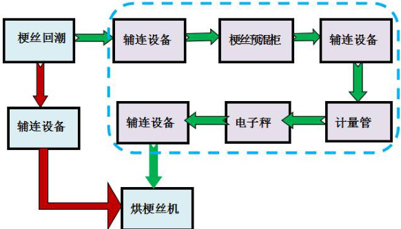 梗丝预混工序是我车间 2008 年年底技改项目。梗丝回潮后不直接进行烘梗工序,而是先进行预混储存,以达到均匀回潮后梗丝水分、温度和成分目的,对提高烘梗质量,进一步提升卷烟产品内在品质具有重要作用。设备工艺简图如下(虚线框为技改新增设备):
