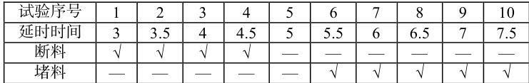 根据计量管进料控制原理,结合现场试验,调整优化光电管延时 T 的时间,延时时间从 2s、2.5、3s、……..7.5s。试验结果如下表: