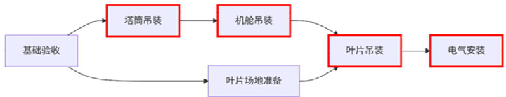 业主依据总工期、设备到货及天气窗口,组织四方共同编制网络计划;关键线路、弹性时间及风险缓冲一并纳入。进度计划应综合考虑风机吊装的各项工序,包括设备进场、吊装准备、塔筒吊装、机舱吊装、叶片吊装、电气设备安装调试以及验收等各个环节的时间安排和先后顺序,并充分考虑各工序之间的逻辑关系和搭接方式。通常采用网络计划技术或横道图计划等方法进行编制,明确关键线路和关键工序,合理安排各风机的吊装进度(如图 1)。在编制进度计划时,还需要预留一定的弹性时间和风险应对措施,以应对可能出现的恶劣天气、设备故障、材料供应延误等不确定因素对施工进度的影响,确保吊装工程能够按计划顺利完成。