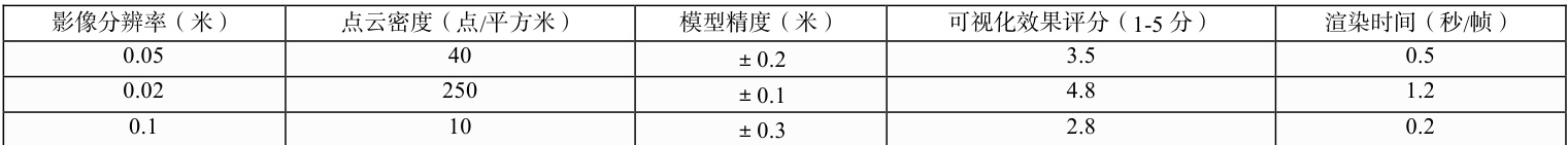 三维模型是否准确,主要由点云密度与纹理质量决定。高分辨率影像(如 0.02 米分辨率)能够生成高密度点云(点间距 ⩽0.1 米),从而构建细节丰富的三维模型(见表 2)。从纹理质量角度来看,选取适当的图像作为纹理源以及色彩校正、光照调整等措施能够显著增强模型可视化效果。另外模型中光照设置,材质属性对用户视觉体验有影响。通过对这些参数设置的合理,能够达到对模型进行真实感渲染的目的,让用户犹如身处真实场景。