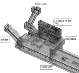 (2)新增换乘通道、取消换乘节点层,使设备区面积不足,综合考虑分为两部分调整,一部分为区间活塞风,将其移至临近区间内作为区间风井设置,其余部分为车站通风设备,将此部分作为地下四层附属设备区,外挂在 1 号风亭组附近。原车站主体内新、排风道调整至 1 号竖井横通道内部,合理利用车站主体开挖既有的结构进行设计,打通了主体与外挂附属的连接,从附属实现对车站主体大系统、小系统、水系统控制联络。并将其他出入口的无障碍电梯移至此区域,减少了单独的竖井开挖工程,节约了 1 号竖井横通道回填量,直接减少了附属数量与工期。车站规模也进行优化,公共区应进行安全疏散计算,验证后满足疏散时间要求。调整后既实现了结构断面的优化,也节省了工程量,并保证了车站基本使用功能。