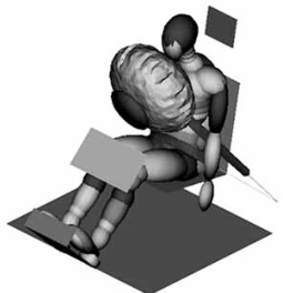 利用 MADYMO 软件构建汽车乘员约束系统模型,如下图所示。在该模型中,触发形式包括以下几种类型:1.人体和汽车内部接触。2.人体和安全气囊、安全带的接触。3.安全气囊和安全带接触,同时涉及气囊自身接触。在前两种接触种,接触表面穿透力和刚体接触刚度关系到接触力大小,通过调整穿透量和卸载曲线等,可以确定刚体接触阶段中产生的非线性弹性力和粘滞阻尼力。