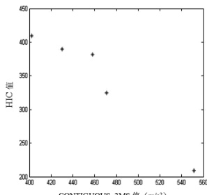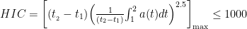 上式中 a(t)代表碰撞 阶段头部质心合成加速度。 t2-t1 代表头部损伤最大值的时间间隔,在实际应用中设置 36ms 为最大时间间隔,HIC 值耐受限度为 1000