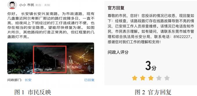 当前,各城市对市政路灯管养提出全新要求,管养标准不断提升,发挥出市政路灯最佳效能。以某城市为例,引进第三方考评,人民群众有权监督检查路灯运行情况,发现问题拍摄照片并通过各类渠道反映给相关管理中心,如图 1、图2 所示,提高市政路灯管理水平。另外,某些城市要求市政路灯亮灯率必须高于98% ,故障处理率达到 100% ,发现路灯故障第一时间派出维修人员进行处理,且电缆、架空线路故障等应做好安全处置并及时汇报有关部门,除特殊情况外,必须在48 小时内完成市政路灯修复工作[2]。