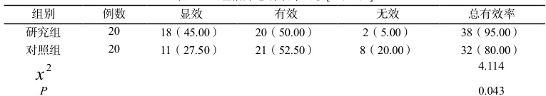 对两组焦虑症患者治疗总有效率进行对比。研究组 20 例,总有效率达 95.00% ;对照组同样 20例,总有效率为 80.00% 。研究组总有效率明显高于对照组,且差异具备统计学意义( P<0.05; ,具体数据见表 1。