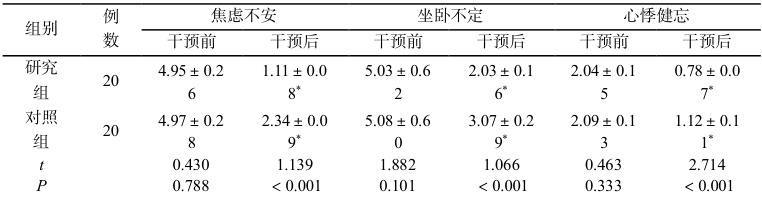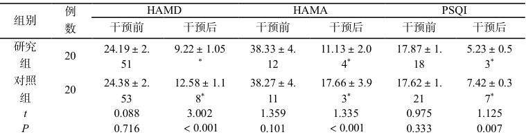 两组焦虑症患者干预前后负性情绪(HAMD、HAMA)及睡眠质量(PSQI)评分,每组 20 例,干预后研究组各项评分均低于对照组,差异有统计学意义( P<0.05) 见表 3