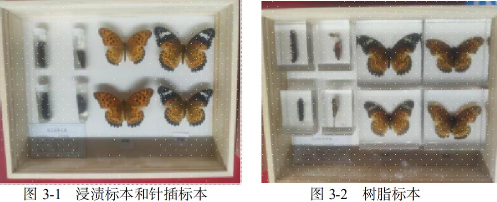 在标本保存技术方面,本研究采用了树脂制作标本法替代传统的针插标本法和浸渍标本(如图 3-1),树脂材料因其具有良好的化学惰性,能够形成有效的保护屏障,阻隔水分、氧气及其他环境因素对标本的损害,防止标本发生氧化和腐烂等现象,使标本能够长期保持原始的形态结构,从而能长期保存和研究。