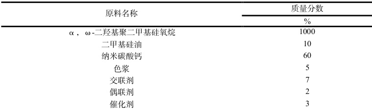 ·s 黏度的α,ω-二羟基聚二甲基硅氧烷、二甲基硅油加入到真空捏合机中,开启高速搅拌混合物料 5min ;然后在高速搅拌下分 3 次投入纳米碳酸钙填料,投完后持续搅拌待物料升温。当料温在 110℃以上时抽真空(真空度- -0.09MPa 以下,下同)持续搅拌脱水 3.5 h,最后关机待物料冷却至室温后即可 使用。将冷却后的基料加入到双行星搅拌机中,之后开始投入交联剂,在抽真空条件下均速分散 30min ,然后在氮气保护下加入偶联剂、催化剂并继续抽真空下分散 20min 出料后密封备用。