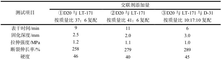 试验考查了交联剂添加量对密封胶表干时间与固化深度等固化性能的影响,结果如表 2 所